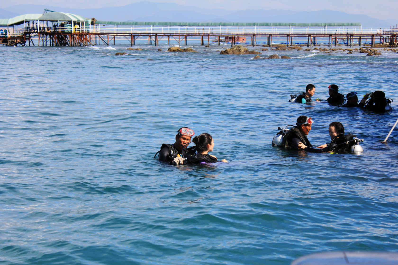 3.穿戴装备。除了脚蹼以外,所有的装备都穿戴好,然后淌入水中,并留意脚底尖锐物。水深大约到胸口时,戴好面镜,BC充气,穿上脚蹼,然后慢慢走向更深的水域。