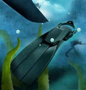 真是一个好天气,那天在湖面上,Scott 在船附近进行了一次简短的潜水,然后返回水面,向 Joey 解释潜水装备的运作使用。当 Joey 从 Scott 手里拿过装备并穿戴好时,他显得很紧张,但是他也感到一种莫名兴奋,第一次在水下呼吸的感觉让他着迷。当他第一次把脸埋进水里,他踌躇了一下,但随后他就放松下来,慢慢从船边 向外移动。所有他身上的装备都让他感到不适而笨拙,但他知道他要去适应这感觉。当他开始下沉时,他也开始享受并想象自己和 Scott 一起去世界各地潜水。他开始踢动他的脚,却发现没有什么反应,他低头一看,脚上一只脚蹼脱落了,他开始手忙脚乱升上水面。