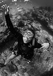 海洋给她的感觉就像是撵碎她,BC和她正在穿的湿式潜水衣似乎在扼杀她。Sandra 越努力尝试从调节器吸气,她得到的气越少。她用颤抖的手检查她的仪表 ,它们显示气瓶有大量的空气,那肯定是她的调节器故障了,Sandra 感到心跳加速,并试图控制她的快速、变浅的呼吸。Bill 在哪?他是潜伴!因呼吸困难而绝望,她唯一想到的就是到水面去,丢弃“无用”调节器,保持她最后微薄的呼吸,她开始尽可能快地游向水面。