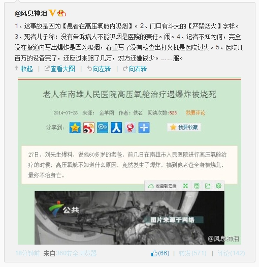 2015年4月,广东某医院发生一起高压氧舱起火事故,一名在接受高压氧治疗的病人不幸身亡。事故的原因还没有定论,但是有报道称现场发现了打火机。