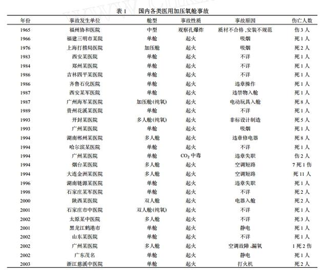 从1964年中国第一台医疗高压氧舱投入使用到截稿(论文收稿时间是2009年2月),总共有38起高压氧舱事故,造成77人死亡8人受伤。而当时中国在用的高压氧舱有接近4000台,数量居全球第一。