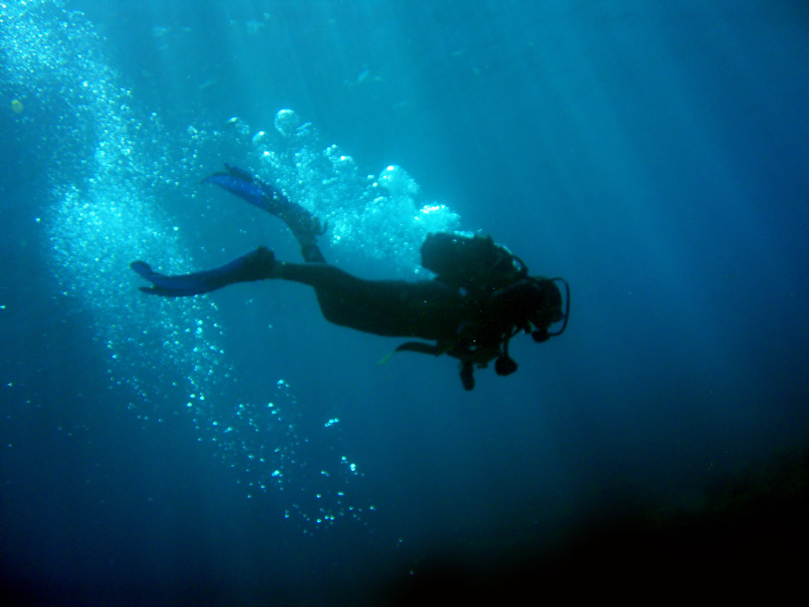 那是一个当地比较出名的潜点,两个半连通的开放式水下山洞。大概在水下20米深,从洞外几本可以看到整个洞内情况。在潜水brief中,潜导已经告诉我们,这两个相连的洞顶,是一个有气室的地方。下潜,一切正常,下降到洞口时,看到一队一队的潜水员从洞口进进出出,再往里面看,漆黑一片。心跳加快,变得气短急促,环视周围,除了黑压压的洞穴,就是无边的大蓝水,不利于放松,重新把眼睛投到潜伴和潜导身上。不能马上跟随入洞,努力调整呼吸,但在安静得只有心跳声的深度中听到了另外一种声音——气瓶漏气的滋滋声!情况似乎越发严重,不安地让潜伴帮忙检查了气瓶,被告知OK,这时潜导已开始带着大家进洞,深呼吸几口气之后,找开手电跟着大家一起进洞。