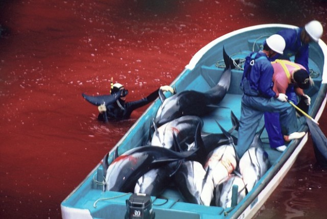 首先,海豚被一种野蛮的方式驱逐到日本太地町一个狭小的海湾,最漂亮的被筛选出来卖到海洋馆,剩下的多数被屠杀,作为人类的食物——虽然海豚肉含有高度危险的化学物质和重金属,但是人们还是认为这是来自深海的健康食品。还有很多死去的海豚尸体被运到化肥厂,瑞察的调查发现,这些有毒的化肥被出口到了中国。