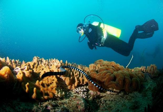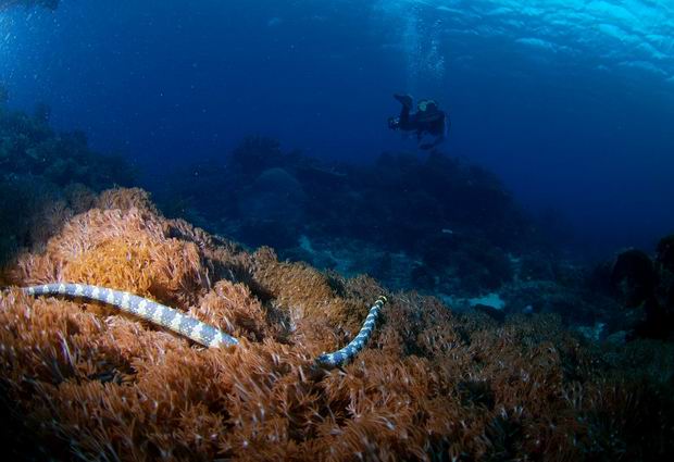 潜水多年从不曾抓海蛇玩,一方面是尊重,再方面还是有所忌惮,万一碰到哪条扁尾巴的家伙心情不爽,从不攻击人的这回破了戒,岂不自找麻烦,也不能对牠说「那么多潜水人为甚么只咬我?」搞不好它会回一句「因为你看起来就生的一幅倒霉相」….