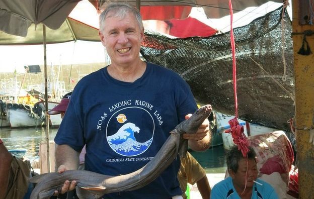 戴夫·艾伯特拿着一条台湾渔民捕获的皱鳃鲨