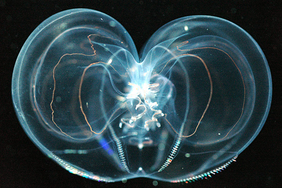 栉水母门曾经与刺胞动物门统称腔肠动物,但是目前已经分开。栉水母与水母外形相似,都是透明的,而且多是球型或吊钟型,依靠拍打身体周围的细小栉带在水中游动。当光线照射这些快速运动的栉带,会衍射出彩虹般的颜色。大部分栉水母还具有生物荧光,能自己产生光亮。另外,它们都是肉食动物,许多种栉水母会食用鱼类的幼苗,甚至因此严重影响近海的鱼类数量——包括图中这种5cm长的兜水母目Bolinopsis属动物。