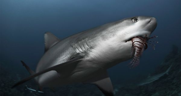 在狮子鱼泛滥的坦岛海洋公园中,一只鲨鱼咬着已经吃掉一半的狮子鱼残骸。训练鲨鱼去捕食狮子鱼是克制这种入侵鱼类的最佳办法吗?