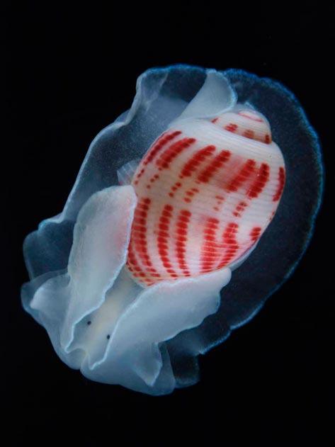 红线纹纸泡(Red-Lined Paper Bubble)根据海洋生物普查的一项估计,日本海域中70%以上的海洋物种尚待发现。在关注如此多的未知物种的同时,研究人员出乎意料地发现从鲸入手或许是个不错的选择。当鲸死亡时,它们沉没的尸体成为各种海洋生物的最好的栖息地。这种腹足动物(属于泡螺科)是最近在日本南部靠近鹿儿岛的深海中一头抹香鲸的尸体上被发现的。
