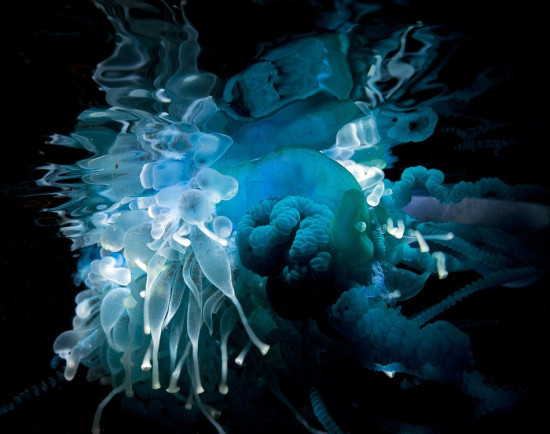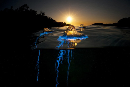 史密斯在澳大利亚新南威尔士州的Bass Point Cove拍下了这些蓝瓶僧帽水母的照片,他被它们颜色瑰丽的外表深深吸引,在史密斯的镜头下,水母的触角在夜色下的海水中发出绚丽的光芒,非常迷人,赋予其仿佛外星生物般神秘的色彩。
