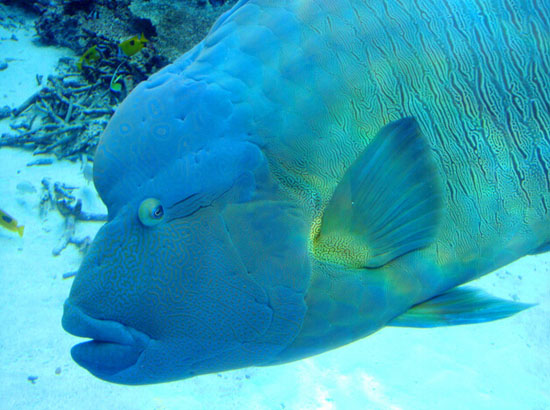 曲纹唇鱼。又称波纹唇鱼,常俗称为苏眉,也有拿破仑、海哥龙王等别名,为辐鳍鱼纲鲈形目隆头鱼亚目隆头鱼科的其中一种。有名的食用鱼,但因近年过度捕捞而被IUCN红色名录列为濒危物种,本鱼通常独居或成对出现。幼鱼常栖息在礁盘内侧的浅水区,成鱼则常出现在礁区外较深海域。