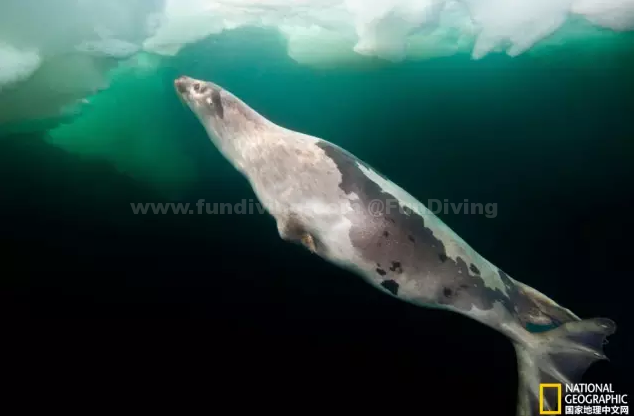 一头雌海豹在海冰之下游弋。人类猎杀成年海豹是为了获取其肉食和油,海豹油可作为健康滋补品销售。