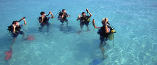 潜水的好处不仅在于水中的奇异世界给人的精神带来的巨大享受,而且更重要的是能够提高并改善人体的心肺功能,在美国及日本,潜水运动甚至被作为一种治疗癌症的辅助手段;据科学论证,水对人体的均衡压力有助于血液循环,水下长时间的吸氧可以有效地杀死癌细胞,并抑制癌细胞的扩散。但因为潜水的费用较高,一般人承受不了。虽然基础培训费只有2千块左右,但相继而来的配置器材与旅费却不是人人都能消化的。一套好的装备,普通的两、三万,高级的十几万。如果想去好的自然海域,近的有马来西亚、泰国,远的有澳大利亚、红海等等,这样的旅行,对多数人而言,还只是一种梦想。所以在中国,潜水尚属于开发阶段,但已有越来越多的人发现了这项运动的趣味与多姿多彩,并积极尝试参与,这个周末gogirl也来到富国海底世界体验潜水。 潜水首先要适应的是在水下以口代鼻的呼吸方式,就像感冒一样。水中的世界四通八达,可上可下,可翻跟斗,真可谓消遥自在,看这两名学员在水中岸上的快乐神情,就不难得知了