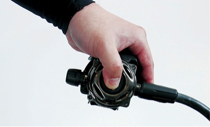 在水中当二级头离开嘴部时,无论是刻意或是意外,最好都要保持吐气状态,哪怕只是呼出一点点小气泡也好。在水中当要将二级头放入口中吸第一口气之前,先咬住咬嘴位置,然后压下排水阀,让压缩气体由咬嘴喷出一、二秒后才开始吸气,目的是借由喷气将二级头咬嘴内部的积水排出,以免呛到水。就算是要呕吐、咳嗽,也要咬住二级头,但是随时要进行排气,才不会让呕吐物阻塞二级头气嘴。调节器由气瓶卸下之前,也要先按压排水按钮将管子内的空气释出让压力释放,才能顺利卸下调节器。