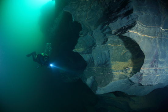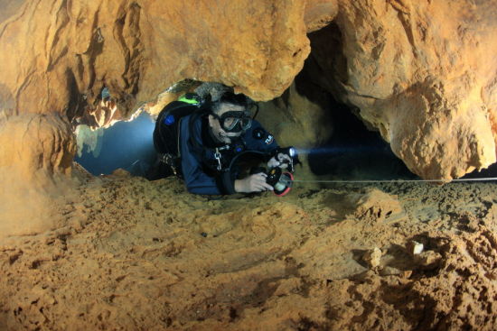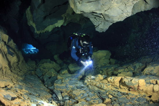 广西武鸣,水下洞穴系统中常有狭窄分叉的通道,潜水员需要挤过去。
