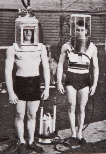 两位潜水员佩戴着从潜水钟改进的玻璃潜水罩。