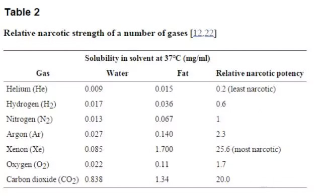 所有学过技术潜水课程的同学大概都知道,根据Meyer-Overton理论(我必须再强调一遍,这只是众多的假说之一,相对有较多的数据支持而已。下一节写氮气的时候会详细解释内容),氦气的脂溶性是氮气的1/5,所以其麻醉性也只是氮气的1/5;也知道应该如何计算trimix中的氦气比例,以降低氮气比例,达到给定的,通常不超过40米甚至低于30米的等效麻醉深度(END)或者等效空气深度(EAD)。