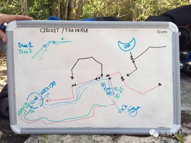 去上Cave 2之前,最大的心愿当然是能够学好跳线(jump),洞穴环线(circuit)和洞穴穿越(traverse)的计划、方式和流程。每天一潜,每潜三小时,想往哪跳往哪跳,想从哪出往哪出一直是我的梦想。然而根据Cave 1的经验,教练总要先考验下你的基本功,所以Danny第一潜就让我们跳线的时候,我是有些受宠若惊的。