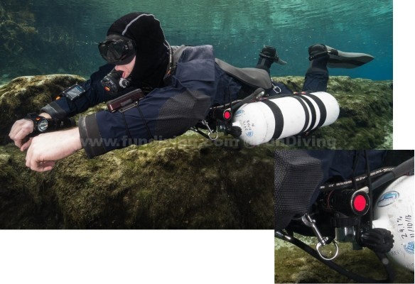 - 透过适当的环形绳调整,气瓶可以维持更贴身,更流线型 – 特别是对胸型轻薄的潜水员。这能產生较少的水阻,在水中保持流线型,并且减少对脆弱环境的伤害。