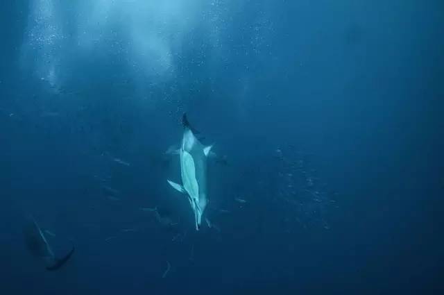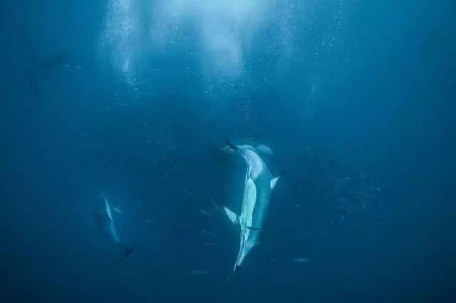 最奇特的是,这场盛宴中,体型不同的鲨鱼都奔赴如此盛宴,槌头双髻鲨、铜鲨、黑鳍鲨、虎鲨和大白鲨,宽吻海豚、普通海豚也结队而上,曾经的天敌在沙丁鱼面前结成同盟,共同围剿沙丁鱼。