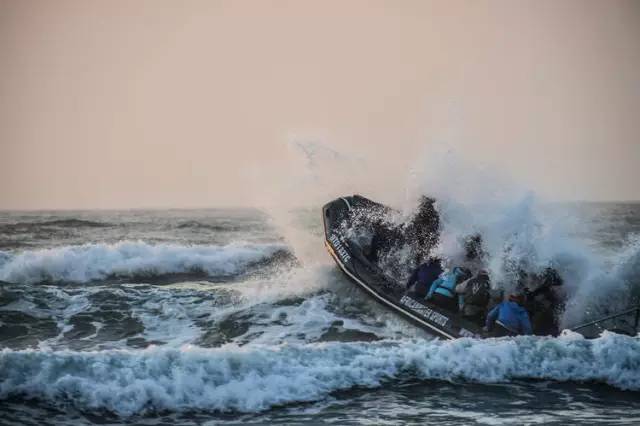 于是冲锋舟以最大马力急驰在海面上,在快速凌空前行又坠至海面时,艇身会和海面硬抗,由此产生猛烈的撞击,此时感觉就像是在水泥地上急速跳跃一般,全身都震抖得快乏力了。