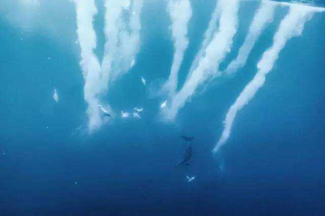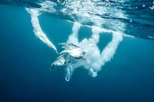 鲣鸟扎入水底形成的V字型白色水雾线条,它们会在沙丁鱼出没的海域,盘旋在海面二十多米的低空,有着非常敏锐的视力。