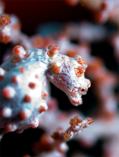 这里与布娜肯的景观是完全不同的,是一个开发的潜点,海洋学者认为苏拉威西及 Maluku 海之间的水域是养份非常充足的地方,更是地球上生物种类最多的所在。所谓的蓝碧海峡,是位于北苏拉威西和蓝碧岛之间的狭长海域,宽度只有 1~2 公里之间。此处的潜水点大多位于海峡内苏拉威西或蓝碧岛的岸边,水深 5~20 米,但能见度不佳,因为此处为火山岩地形,海底多为火山泥的沙地,但也因此才能培养出如此丰富的生物物种。因为外有蓝碧岛阻隔了外洋的风浪,所以海峡内大多是风平浪静,且所有的潜点都在船行30分钟之内可达,相当方便。这里布满了平常珊瑚礁海域罕见的海洋生物:鬼龙(Ghost Pipefish)、豆丁海马(Pygmy Seahorse)。