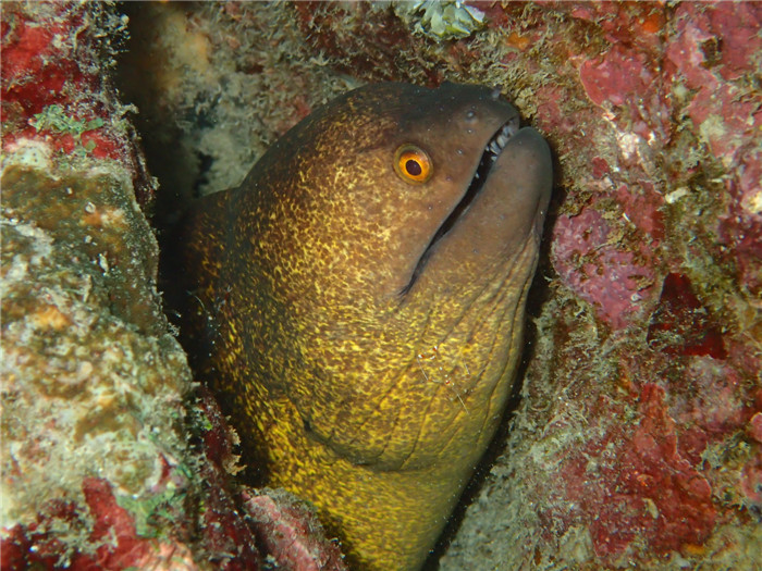这里有很多巨型海鳗。直径大概在25厘米粗,1.5米长。晚上能看到有这些大海鳗游出洞口觅食。但这里晚上通常大流,不建议在这里做夜潜。