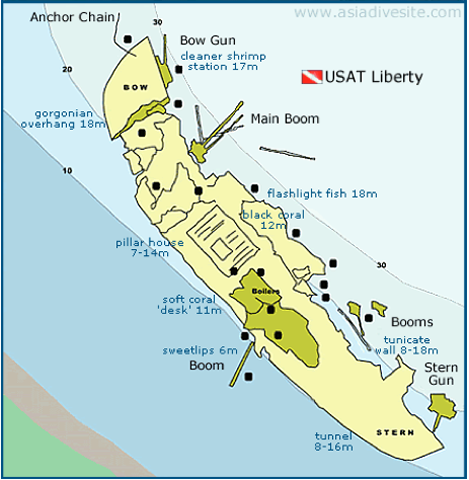 美国沉船 USS Liberty 的确是巴厘岛最著名而可接近的潜水景点。这壮丽的二次世界大战沉船只有离海岸一分钟,拥有美丽的珊瑚结构及上百种鱼类。沉落在黑火山沙堤,沉船从5米开始倾斜到30米。船的长度较大,约120米,不常有急流或海涨,适合多阶层的潜水员。这儿也有定居的大眼鱼鲹群,它们并不害怕潜水员而会让您靠近。