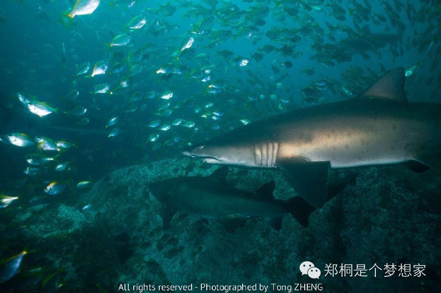 对于潜水员来说,Inner Rock虽然有无敌的能见度,但是底下真的除了石头东西不多,我们这次也是比较探索性质,不过不是很推荐。主要如果Looking Glass不能潜的话,North Rock可以作为一个不错的代替潜点。North Rock也经常可以看见大群的灰护士鲨 (Grey Nurse Shark),中国也叫做 沙地虎鲨,澳大利亚虎鲨。这种鲨鱼最著名的特征是侧面的斑点,以及龅牙。看起来很凶残,其实非常打酱油,完全对人没攻击型。但是还是那句话,Show Your Respect to Animals。所谓人不犯我,我不犯人。兔子急了还咬人,别说鲨鱼了。一般伴随着鲨鱼存在的就是这种大群的小黄鱼群,非常夸张的漫天都是,看到后简直不敢相信自己的眼睛。这次的照片在底下,虽然没有第一次去的时候的Looking Glass好,但是也勉强能看。
