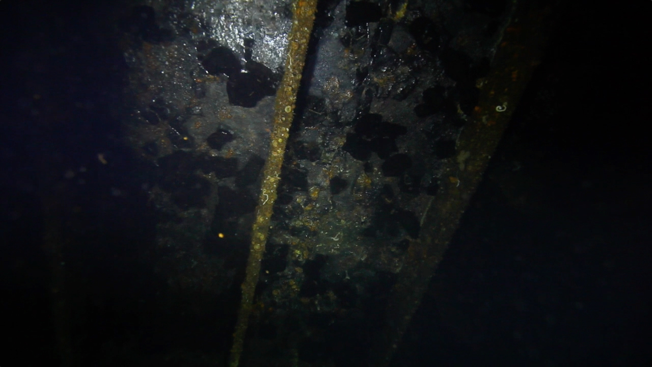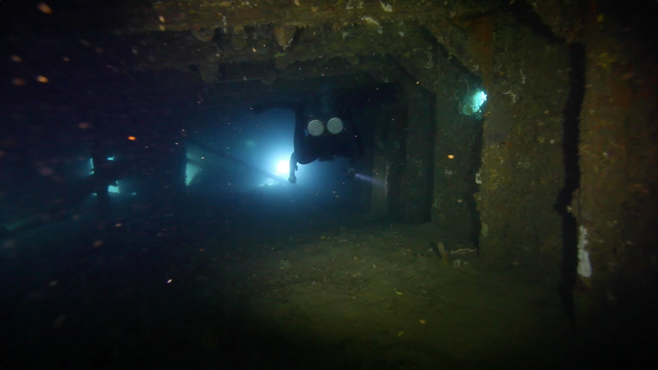 这艘船难度不大,却非常有趣,你可以选择从断裂的前部进入舱体,但我和SU却多次选择从螺旋浆舵处进入轮机舱。在这里的穿越长度可以达到100英尺以上。我们通过狭窄的裂缝,轴承的孔,一个舱室到另一个舱室穿过,最后由前部裂缝出来,在沿着甲板到达下水时的下潜绳。当你潜入的时候,你真的会感觉到它是在战争中被炮弹击中而沉没的。船体的整个前部都已经破碎,巨大的钢板被扭曲得不成样子。