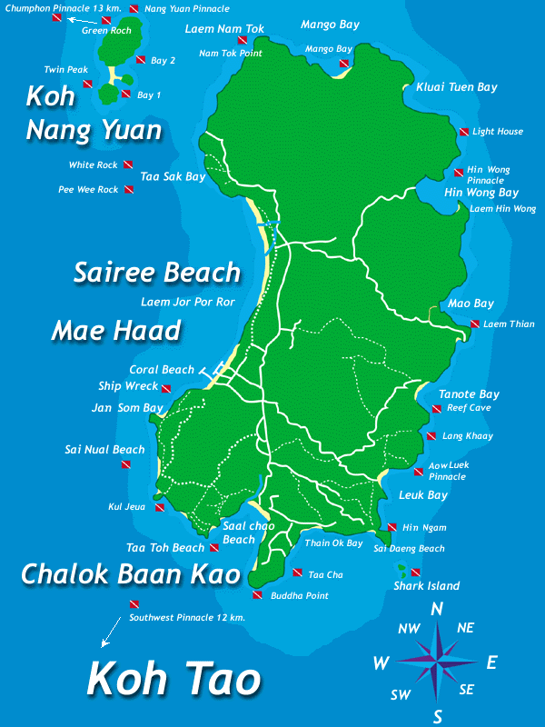 由于水下资源的丰富,并且有赖于泰国政府禁止渔民在涛岛(Koh Tao)近海捕鱼的规定,所以单单围绕在涛岛(Koh Tao)周边的潜点(dive site)就有25个之多。(上图红色小框,是潜水地图中潜点位置的专用标示)。在这些潜点中,大部分贴近岛外的潜点都是水流温和、情况简单适合所有课程(初级、进阶、专业)学习的教学潜点。当然也有很多适合进阶和专业潜水员探险的advanture site。