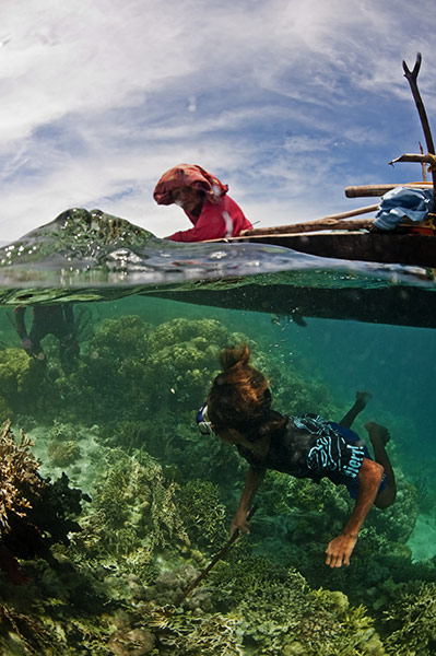 伊布·阿耐(Ibu Ane)看着自己的儿子拉姆丹(Ramdan)在珊瑚礁里搜寻蛤蚌。阿耐的丈夫死于长期潜水而导致的减压病,因此在长达六个月的海洋采摘期中,她必须得依赖自己的儿子。