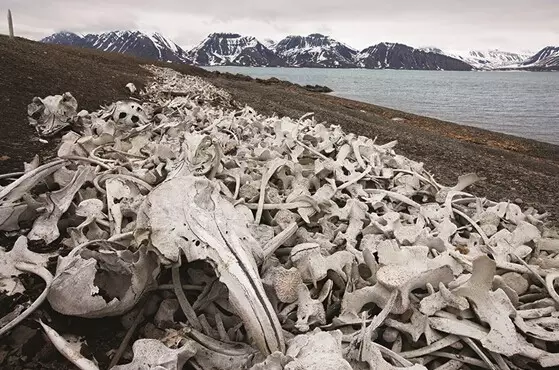 (图片来源于《无尽深蓝》。白鲸的头骨在挪威和北极之间的斯瓦尔巴特群岛沿岸,长长地排列开来。)