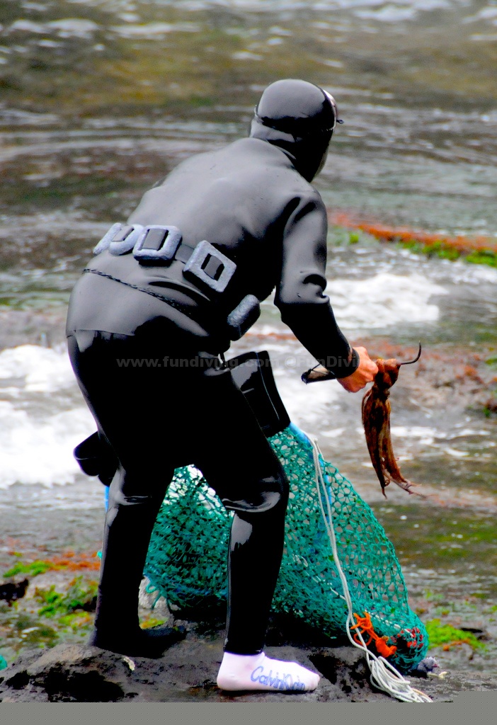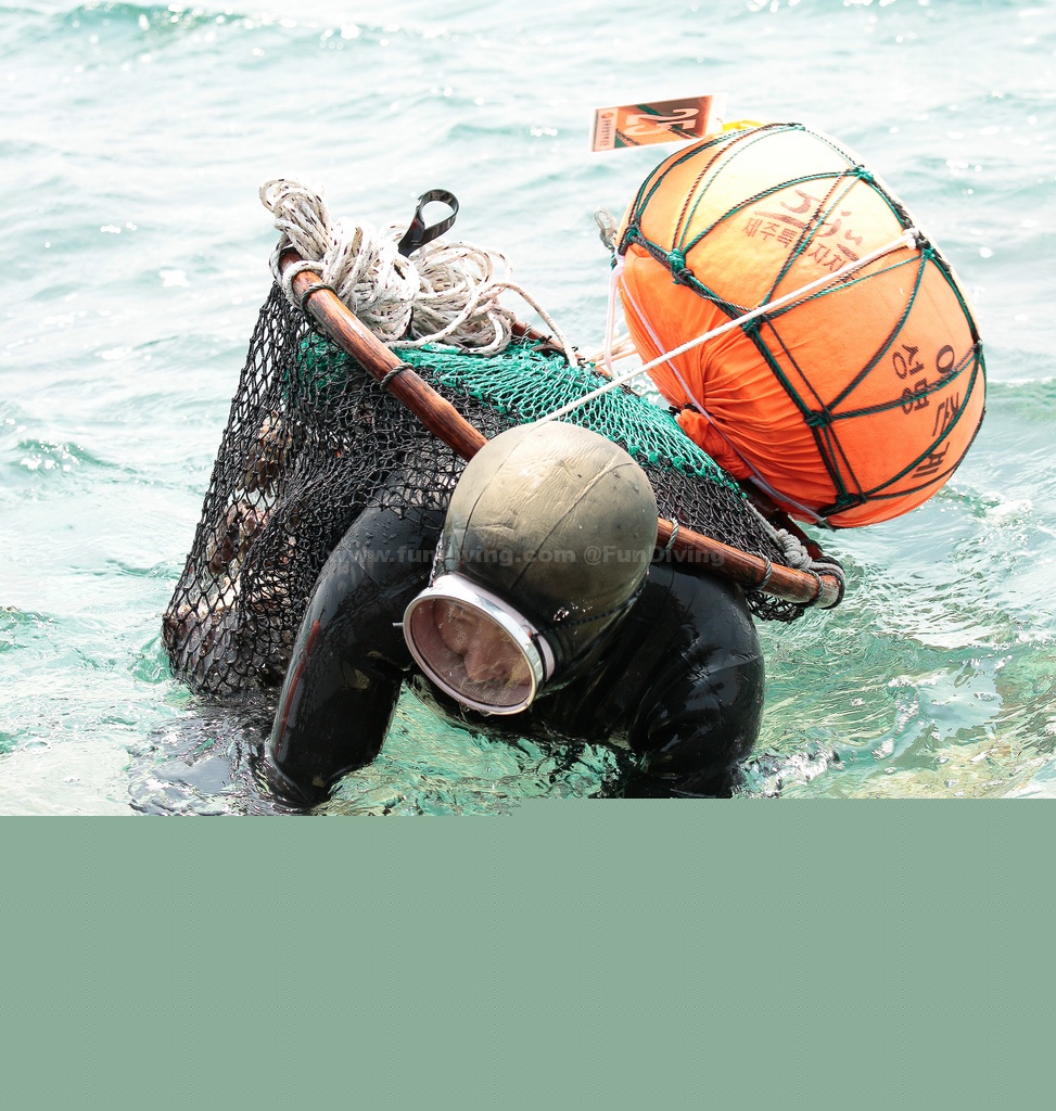 她们只在距岸近的浅海中捕捞。海女们则不得不潜入深海,她们面戴潜水镜、腰系救生绳,潜入较深的海中,用特制的尖刀,撬下海底石头上的珠贝,然后带回海面。