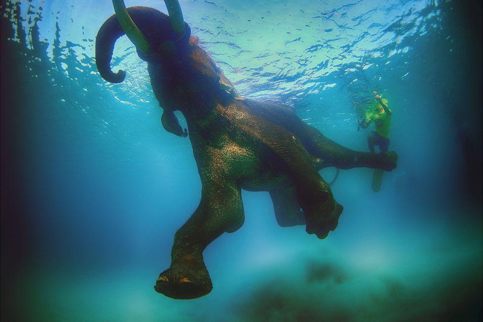 阿里擅长捕捉一些难得的画面,图中一头大象正在水里游泳。