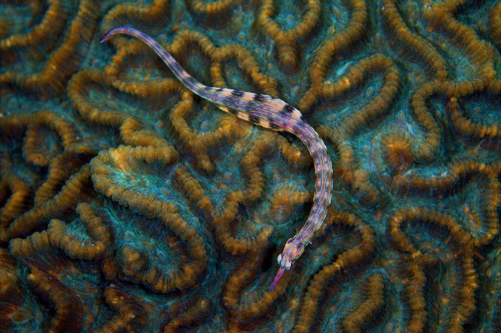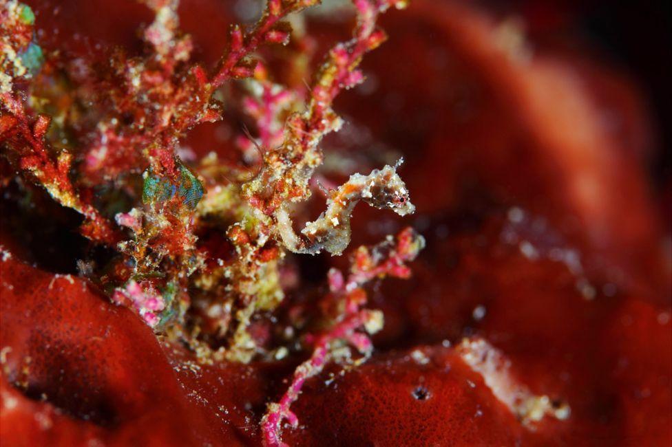 一条海龙栖息在珊瑚上。
