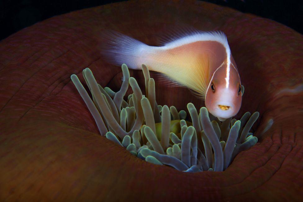 粉红色的小丑鱼守护在海葵旁边,看上去温顺的它实则裹着有一层毒液。