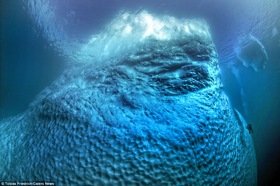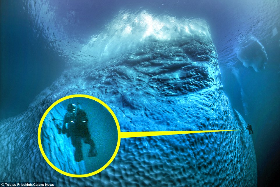 为了捕捉冰山的全貌,Friedrich要潜到水下30米左右的,并忍受冰冷刺骨的海水。