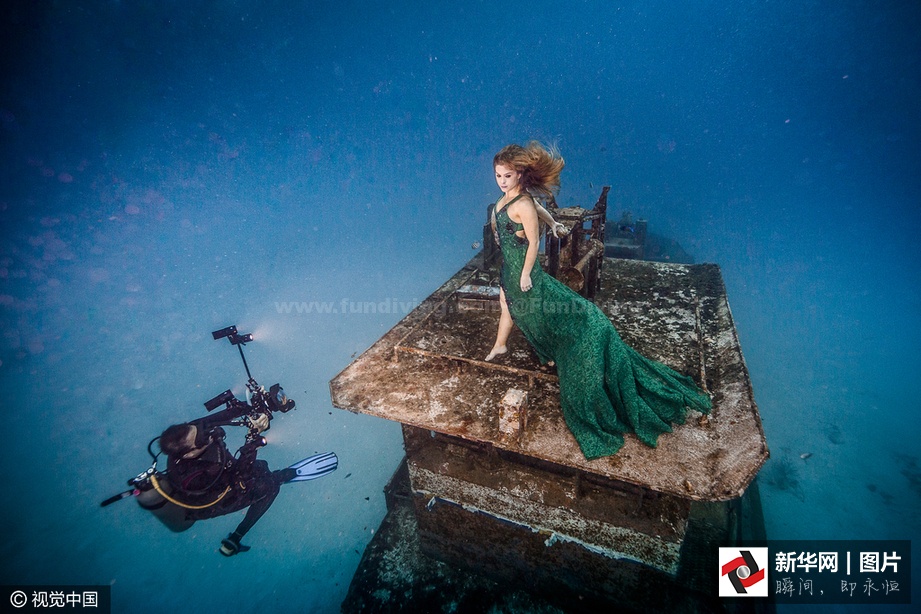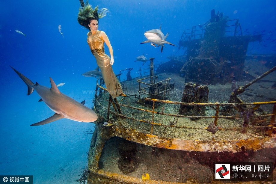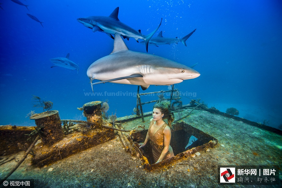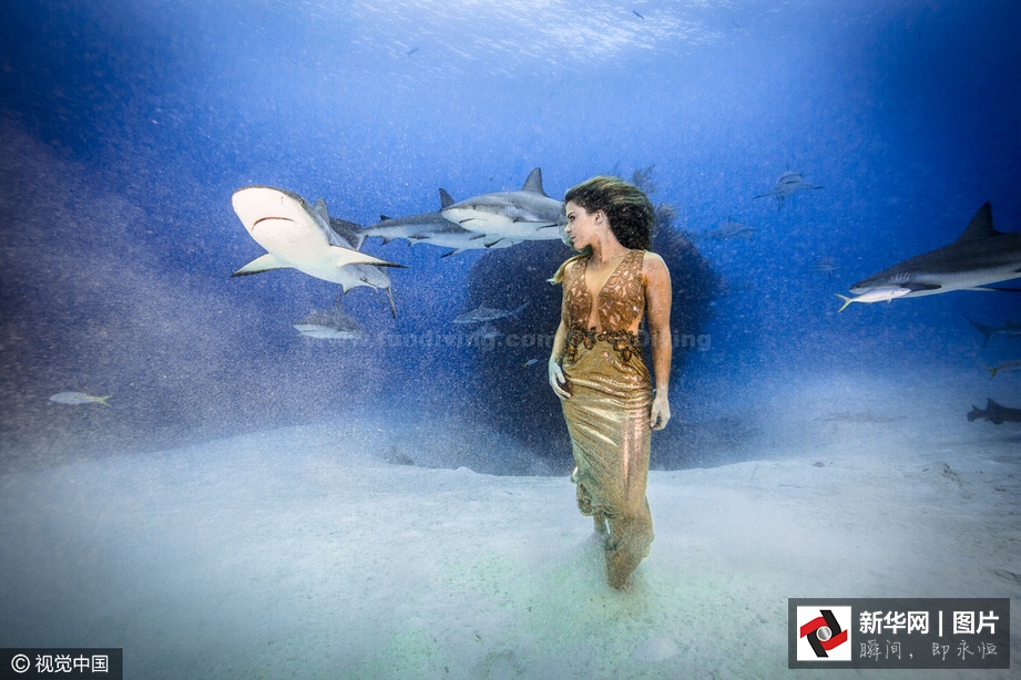 近日,一名拥有多年专业潜水经验的冒险者身着华丽的衣服在巴哈马群岛附近的海中拍摄了一组写真。她在拍摄这组图片时未戴任何呼吸工具,身边还不时有鲨鱼游来游去。此次拍摄活动在一个鲨鱼保护区进行,目的是为了警醒世人鲨鱼面临的灭绝危机。