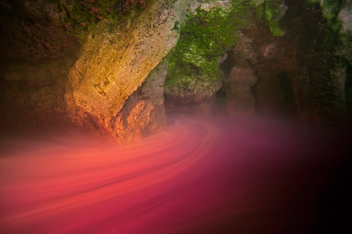 阿巴科锯锯木厂的一个30 - 36英尺深污水配槽里细菌水的颜色。这里和下面无色的一层里,有有毒的硫化氢气体。潜水员以审慎的速度穿过它。