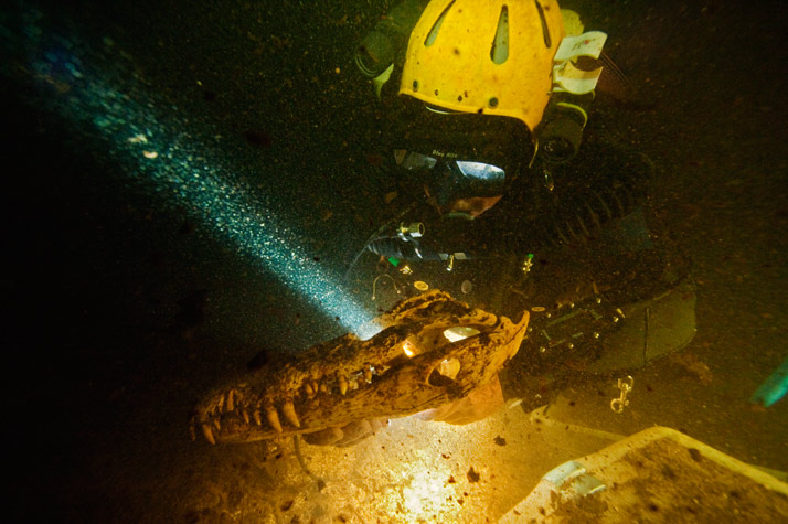 资深洞穴潜水员Brian Kakuk举着一个3000多年前的古巴鳄鱼skull-an。一种不久前在在锯木厂污水槽沉积物里发现的一种动物。这里几乎无氧,蓝洞保护了骨骼完好无损。