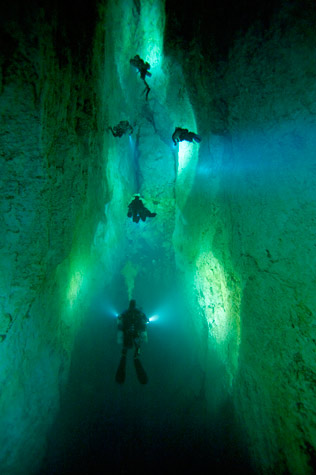 在星际之门,安德罗斯岛的蓝洞,潜水员照亮北部通道。