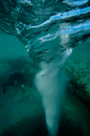 “突然之间,它就把你吸走”摄影师Wes Skiles 说。“极度危险” 的大巴哈马岛蓝洞漩涡。就像一个巨大的浴缸排水管,当潮水进来它吸走数百万加仑的水。“这就像一个大瀑布——没有人能够逃脱掉。“保持距离,一名潜水员设置设备来测量漩涡的流量。