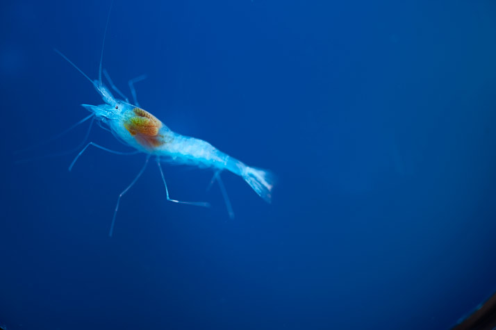 在无光的蓝洞,动物像这种一英寸长的Agostocaris洞穴虾,这样不需要表面的色素沉着。虾只有消化系统的一部分的颜色。