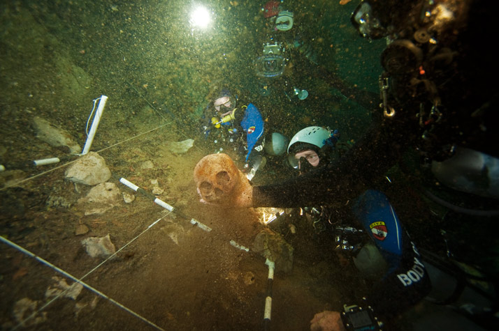 考古学家Michael Pateman在安德罗斯岛的蓝洞110英尺深的圣殿举着印度古老的Lucayan头骨。