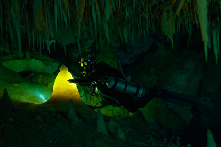 在拉尔夫的钟乳石森林洞里,Brian Kakuk用潜水手照着一个半透明的石笋。海平面较低的时期,当洞穴干燥、石笋和钟乳石增长,最终汇合成列。