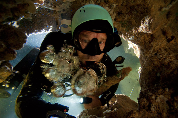 Brian Kakuk阿森纳的工具来收集样本。通过一个充气提升袋来运送石笋到水面,这是研究过去突然的气候变化的证据。