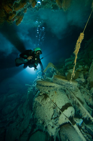 在大巴哈“垃圾坑”里,Kenny Broad蠕动着穿过狭窄的通道,引导绳可以让他安全的返回地面。尽管洋流把垃圾扫到这个洞穴的深处,岩壁生活着各种生命,包括亮红色的苔藓虫;光滑、灰色海绵;带刺的水螅,可以划伤裸露的皮肤。对于许多洞穴潜水员来说,跟Broad一样进入一个以前未探索过的通道,是很神圣的。