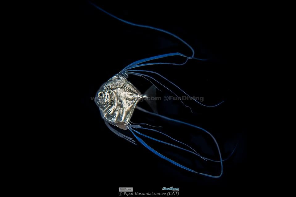 Juv. Threadfin Trevally Black Water at UWMP #5 @Cocotinos Lembeh and Kasawari Lembeh Resort Nikon D810 with 60mm Macro Nauticam Housing with Inon Z240x2 Lighting: Weefine 10,000 Lumen x 2 + RGBlue System02 1/250sec at f/14, ISO100 Photo by Pipat Cat Kosumlaksamee
