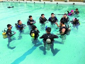 花了一个上午学习完相关的理论知识后,下午的课程在水深在1.5米到3米的游泳池里进行。教练首先逐一了解学员的水性,再根据个人的特点制定课程。一般来说,一个学习班的人数被严格控制在12人左右,一名助理教练在旁协助,如果人数增加,那么教练的人数也需要进行调整。前三天的学习均在游泳池里进行,从第四天开始,学员们被带到6米至12米不等的潜水塔内进行上课。水底空间有限,学员们分组进入。在潜水的过程中,身体语言尤其是手语是交流的主要手段,学员们两两做伴,须学懂如何与同伴传递信息。最后一天,教练把课程中难度最大的技能列为考试科目,只有通过考试,才能获颁证书。既然花了钱,证书是必须拿到的吗?王诗乔摇摇头,“证书上有着教练的签字,今后每位学员就是要怀揣着这份证书走遍天下的潜点,负责任的教练只有在学员通过全部考试才会签字,万一不合格,那只能重学一次。”
